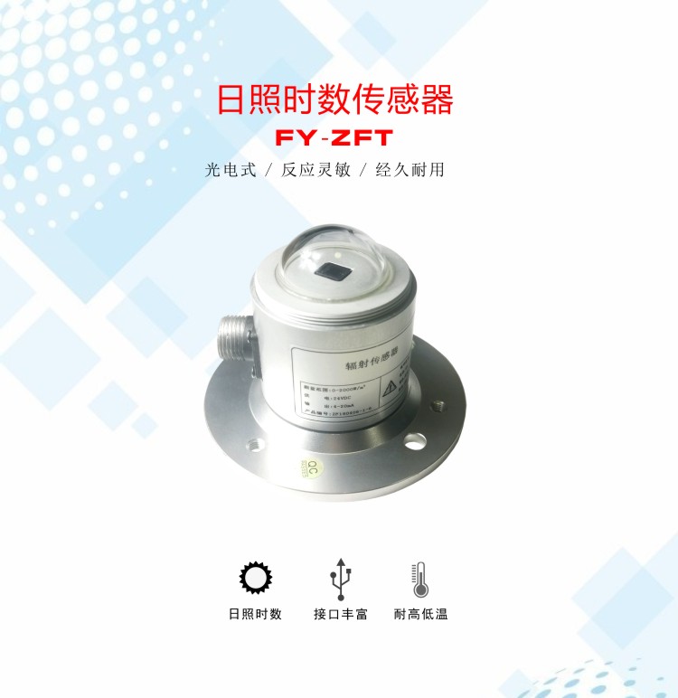 FY-ZFT日照時數傳感器采用高精度感光元件用來測量太陽日照時數,測量原理是根據日照時數國標定義當太陽直接輻達到或超過120w*m-2時間段的總和,以小時為單位,取一位小數。具有線性好、精度高、穩定可靠等特點;可廣泛應用于氣象、能源、環境、農業、建筑等領域。