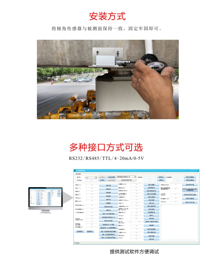 FY-ZQA雙軸高精度數(shù)字型傾斜傳感器。RS485輸出,含總線通訊協(xié)議,支持多個傾角組網(wǎng)。測角范圍±30度,高分辨率,具有響應頻率可調(diào)整; 波特率從(2400-38400bps)可調(diào)等功能。在工程上,將測量槽管埋入地下,當基坑、邊坡、地基產(chǎn)生形變時,使用該儀器測量測斜槽管的變形,將測斜探頭埋入地下,從而可精確測出水平位移量ΔX,Y。根據(jù)ΔX,Y的值大小,作出預報,指導施工。