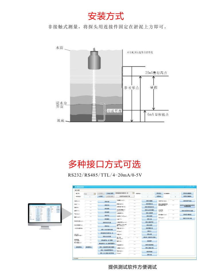 例如:FY-SNW-12V-A1:泥位傳感器12V供電,4-20mA輸出 |