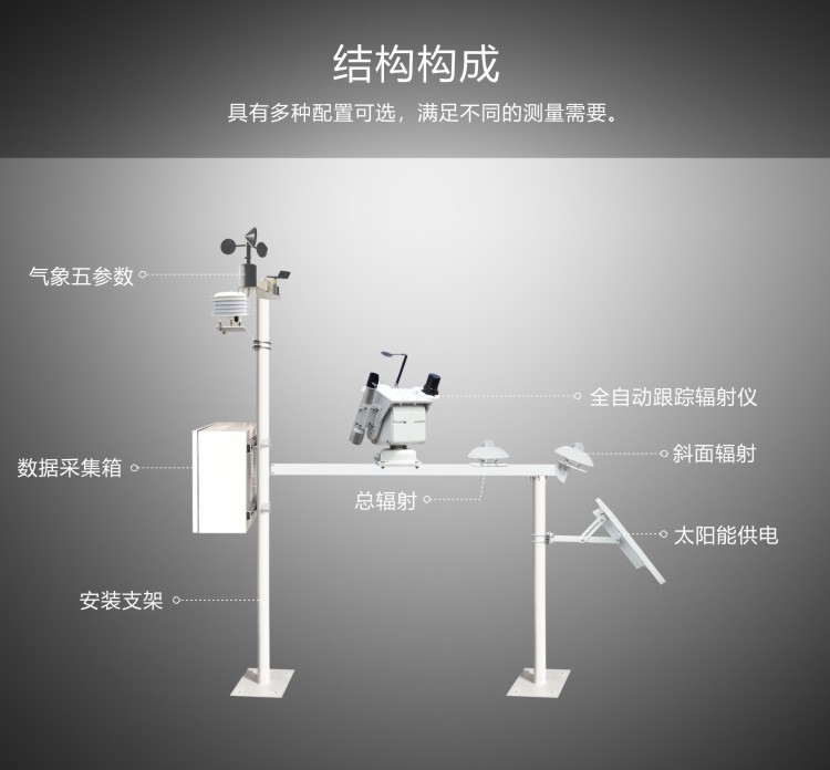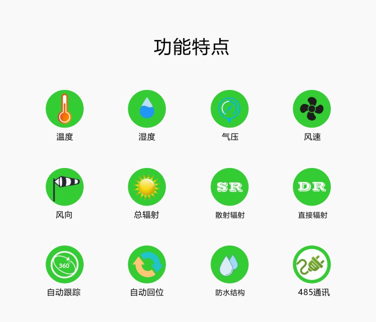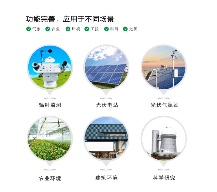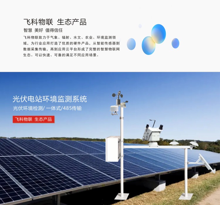 FY-SQ200型光伏電站環(huán)境監(jiān)測系統(tǒng)可觀測的環(huán)境輻射要素有:環(huán)境溫度、濕度、氣壓、組件溫度、風(fēng)速、風(fēng)向、傾斜總輻射、日照時數(shù)、水平總輻射、太陽直接輻射、太陽散射輻射等指標(biāo)。具有性能穩(wěn)定,檢測精度高,完全自動化監(jiān)測等特點,可滿足光伏電站環(huán)境氣象監(jiān)測、太陽輻射監(jiān)測等相關(guān)要求。