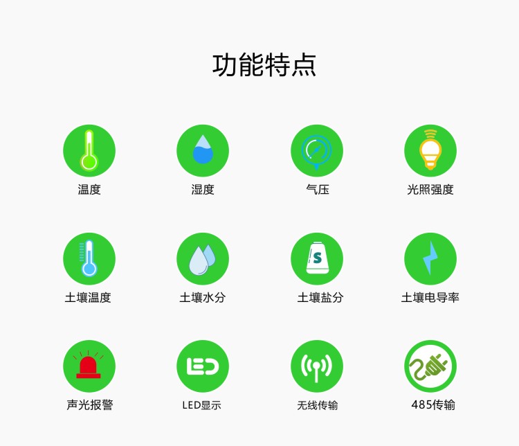 ●測量溫度、濕度、氣壓、光照、土溫、土濕、鹽分、電導率;