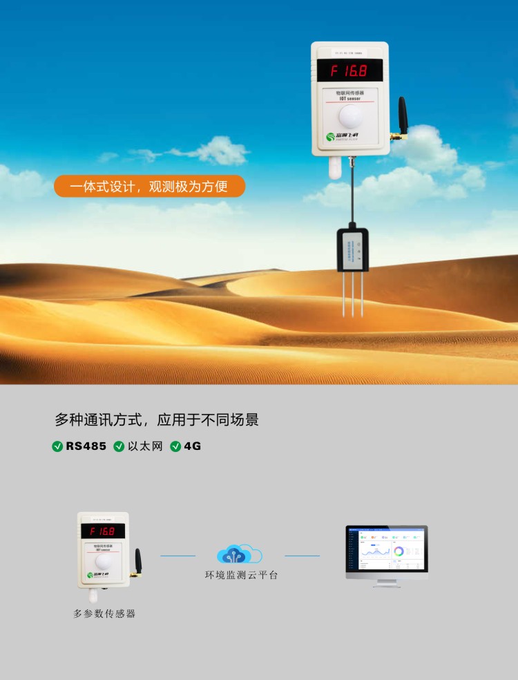 FY-JS5多合一環(huán)境監(jiān)測傳感器采用進口高精度傳感芯片,具有測量精度高、穩(wěn)定性好等特點。采用高清LED數(shù)碼管顯示,可遠距離觀測實時數(shù)據(jù);可對溫度、濕度、氣壓、光照、土溫、土濕、鹽分、電導率等進行同步測量。采用進口傳感元件作為感應部件,具有測量精度高、穩(wěn)定性好等特點,傳感器采用先進的電路集成模塊,可根據(jù)用戶的不同需求輸出RS232、RS485、4G等通訊方式傳輸。儀器體積小巧,安裝方便且便攜,性能可靠;可廣泛應用于氣象觀測、環(huán)境控制、農(nóng)業(yè)、工廠等諸多領域。