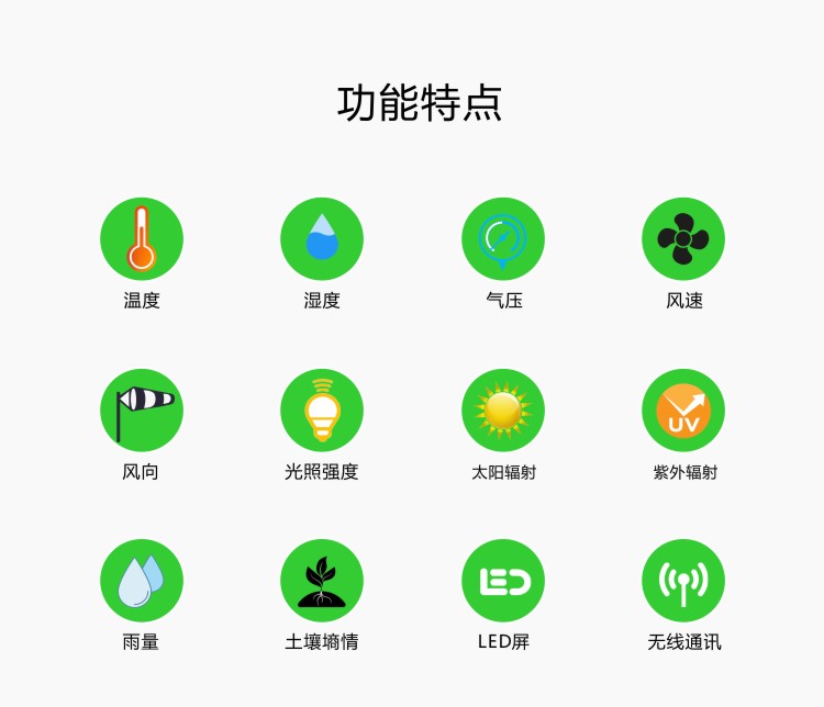 ●測(cè)量風(fēng)速、風(fēng)向、溫度、濕度、氣壓、雨量、光照、輻射、土壤溫濕度、鹽分、電導(dǎo)率、PM2.5等;