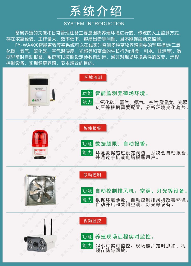 FY-WA400智能畜牧養殖系統可以在線實時監測多種畜牧養殖需要的環境指標(二氧化碳、氫氣、硫化氨、空氣溫濕度、光照等和畜禽的生長行為(進食、引水、排泄等),數據異常時自動報警。系統可以按照設定參數自動運,通過對現場環境條件的改變,遠程控制設備,實現健康養殖,節本增效的目的。