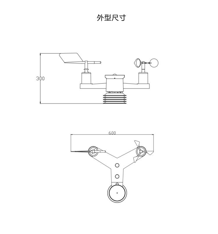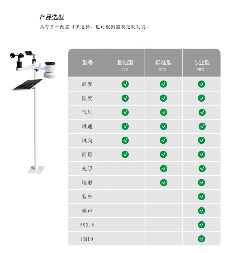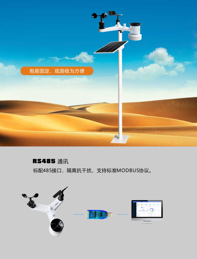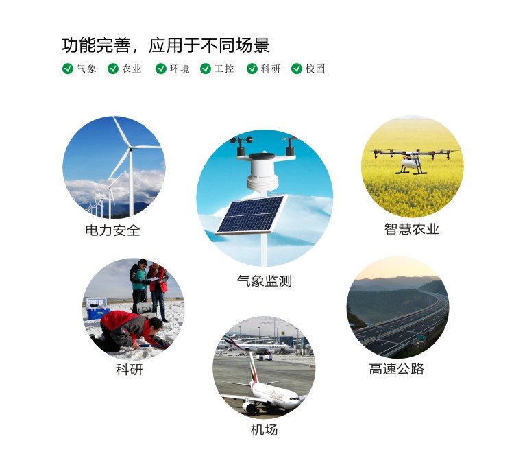 ●測量風速、風向、溫度、濕度、氣壓、雨量、光照、紫外、輻射、PM2.5、PM10、噪聲等;