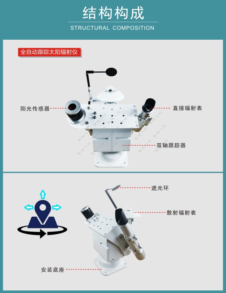 FY-AS2全自動跟蹤太陽輻射儀用于自動測量太陽直接輻射以及散射輻射。儀器采用高靈敏度陽光傳感器以及自動跟蹤裝置,可自動實時精確跟蹤太陽方位,實現太陽直接輻射值以及散射輻射的同步測量。本傳感器可應用于氣象探測、太陽能利用、農業、建筑物理研究、生態監測考察部門。