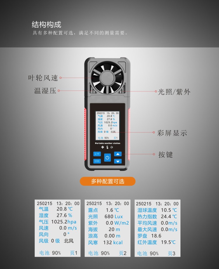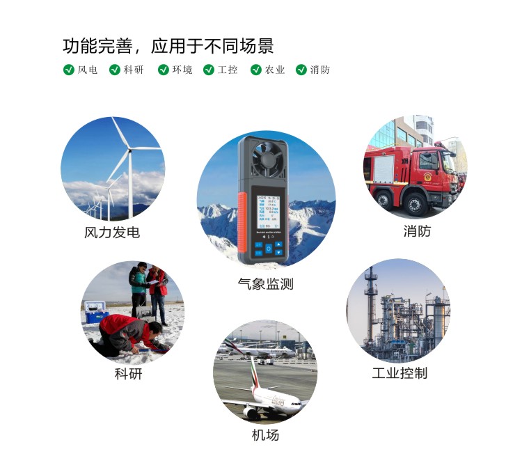 ●測(cè)量風(fēng)速,風(fēng)向、溫度、濕度、露點(diǎn)、大氣壓力、BF 薄福、風(fēng)寒指數(shù)、海拔高度、光照、紫外、跑道溫度等;
