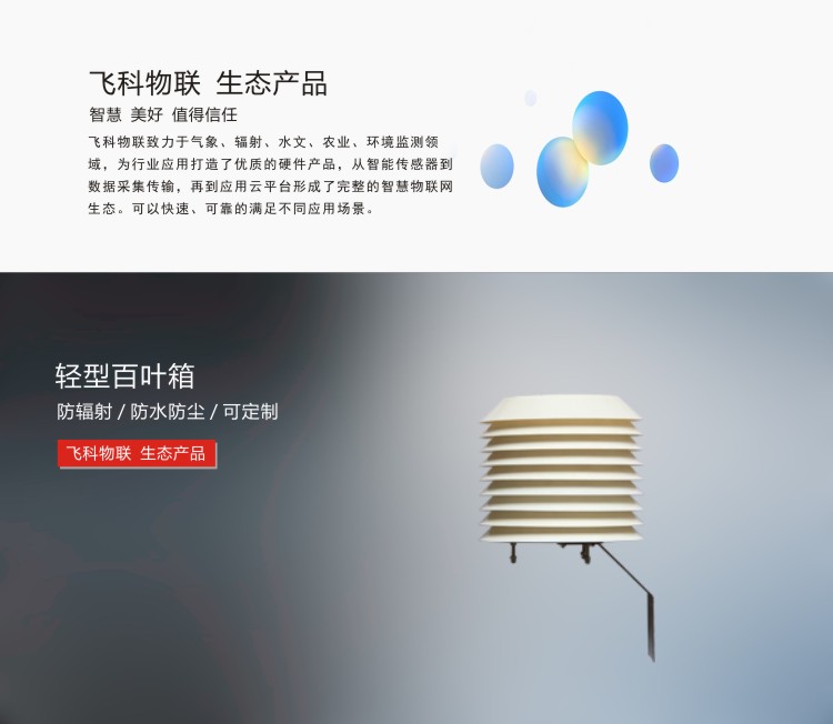 FY-FPMAX輕型百葉箱又稱防輻射罩、通風(fēng)罩,能防止太陽對儀器的直接輻射和地面對儀器的反射輻射,保護(hù)儀器免受強(qiáng)風(fēng)、雨、雪等的影響。并且其特殊的表面處理和結(jié)構(gòu)設(shè)計(jì),抗紫外輻射性能好,耐腐蝕性強(qiáng),通風(fēng)性好,可用于溫濕度傳感器室外防輻射。